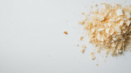 Sawdust on a white isolated background top view with place for text or inscription. Wood dust texture. Sawdust pattern close up background pattern.