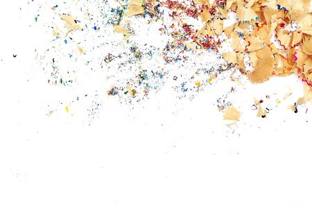 Wooden colored pencil sharpening shavings frame on white isolated background, top view, flat lay, copy space