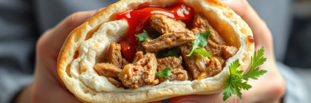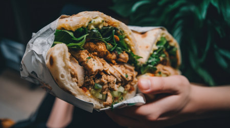 A close-up of a hand holding a kebab wrap, filled with grilled meat, fresh vegetables, and sauces, inviting viewers to take a bite into this delicious handheld meal.