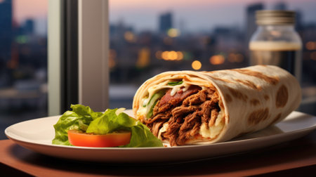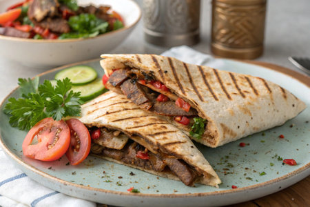 Savory grilled meat wrap served in a casual dining setting with fresh ingredients and condiments