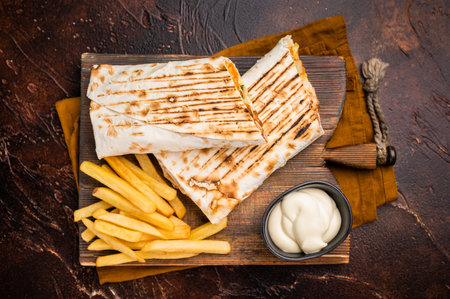 Shawarma chicken roll with fresh vegetables, cream sauce and French fries on wooden board. brown background. top view.