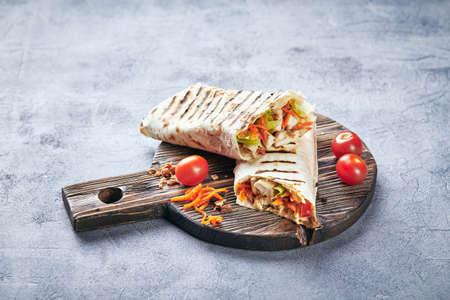 Mexican tortilla grilled wrap with chicken breast and vegetables on concrete background