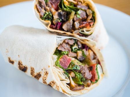Mexican fajita wraps with grilled chicken fillet and fresh vegetables