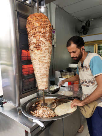 AMPANG, MALAYSIA - DECEMBER 2, 2020: Kebab or shawarma is sold by hawkers in small roadside shops as a takeaway dish. Wrapped with bread and a choice of meat or chicken as well as vegetables.