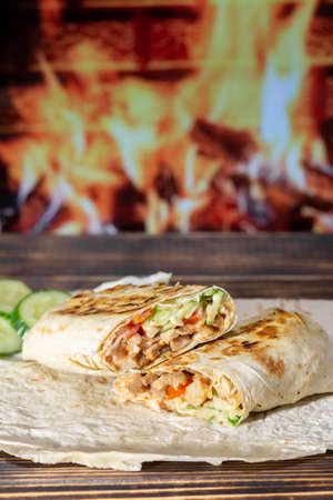 Shawarma with chicken and vegetables in a thin pita close-up on a background of fire.