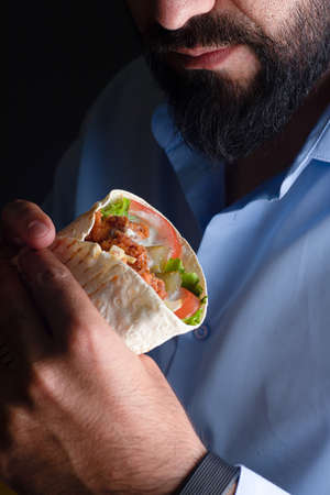 Shawarma doner roll in black pita in man hands.