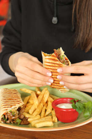a woman holds shawarma in her hands. fast food.