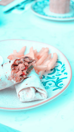 Turkish doner kebab in a restaurant on the street.