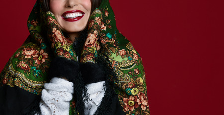 Portrait of High fashion glamour beautiful brunette hair Russian style woman in traditional scarf and gloves on red background