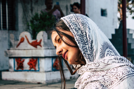 Hampi Karnataka India December 18, 2018 Portrait of Reachel Singh, Dutch professional singer taking inspiration at Hanuman temple in southern India