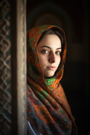 Young beautiful Afghani woman wearing colourful hijab. Arabic Muslim lady in traditional clothes
