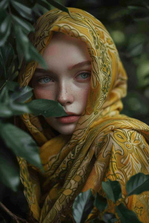 A woman wearing a yellow scarf is standing in a forest. The scarf is draped over her head and neck, and she is looking at the camera. The image has a warm and inviting mood