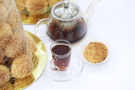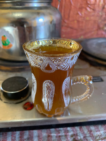 old fashioned cup of tea on the turkish ornament carpet, Authentic turkish coffee and a in a turkish restaurant cafe, tea time break