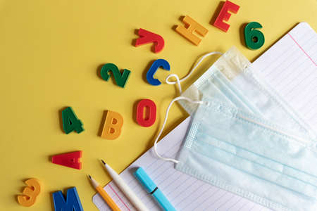 school supplies with medical face mask on yellow background. Protection of schoolchildren and students from the coronavirus covid-19, schooling in a pandemic. Flat lay, top view.post pandemic