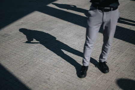 the shadow of a man on a sidewalk. anonymity of the big city.