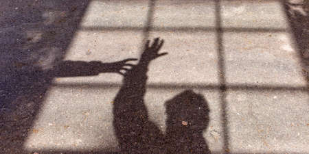 The shadow of the silhouette of a man and a hand against the background of the shadow of a window and a lattice