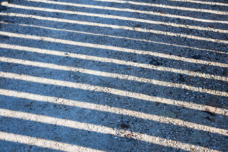 Diagonal and parallel lines of shadow on the asphalt, top view, interesting and unusual background