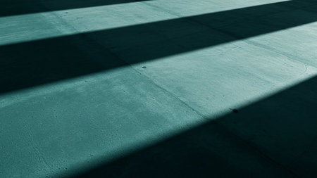 Stark geometric shadows stretch across a cool teal concrete surface. The lines of light and shadow create a strong pattern, highlighting the rough texture of the ground. This abstract composition evokes a sense of modern minimalism and industrial with its clean lines and limited color palette. The interplay of light and dark provides a dramatic and visually striking backdrop.