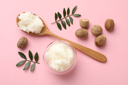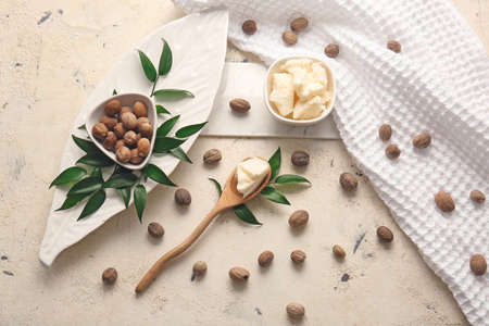 Whole nutmeg nuts and a spoon with nut powder on rustic wooden table close-up. Indian spice.