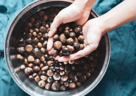 Hand holding Thai puff ball mushroom and washing in a bowl preparing for northern Thai food cooking