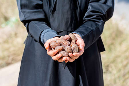 Ripe dates on hand of Muslim woman who wearing back Hijab