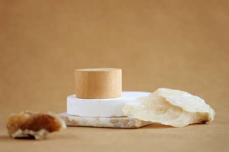 Abstract minimal scene with natural stones. cylinder wood podium on beige background. product presentation, mock up, show cosmetic product, Podium, stage pedestal or platform