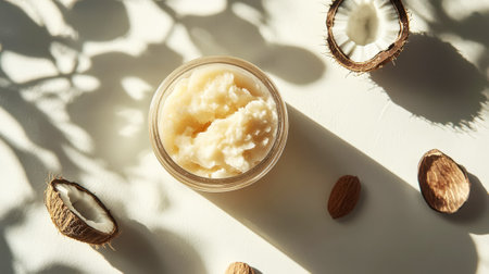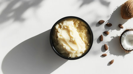 Shea butter and coconut on aesthetic background, top view, organic cosmetic ingredients. Skincare concept. Generative AI.