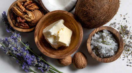 Discover a delightful arrangement of natural ingredients, including butter, coconut, lavender, and nuts, showcasing fresh textures and flavors for healthy cooking.