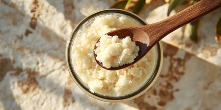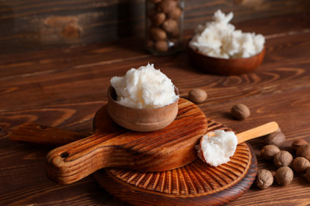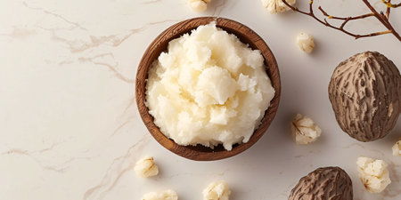 Indulge in the rich, creamy texture of organic shea butter presented in a rustic wooden bowl, surrounded by decorative elements that enhance the beauty aesthetic.