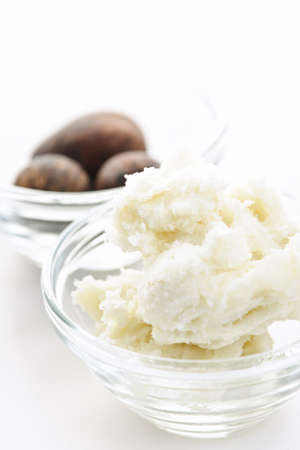 Shea butter and nuts in glass bowls isolated on white