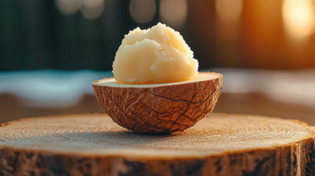 A fresh shea nut with creamy butter resting on a textured wooden board, showcasing nature skincare secret