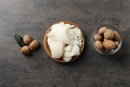 Shea butter with nuts on gray background