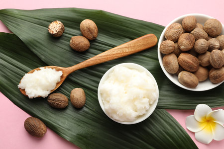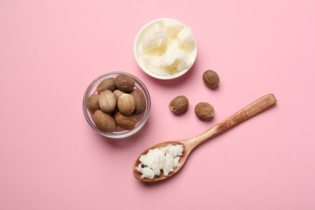 Natural shea butter in bowl, spoon and nuts on pink background, top view