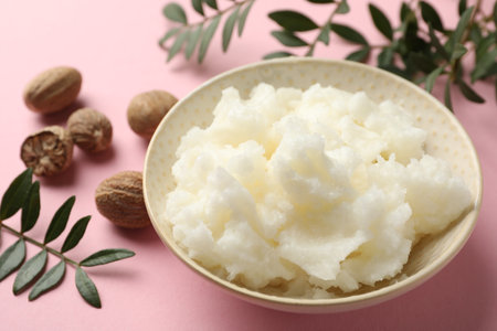 Natural shea butter on pink background, closeup