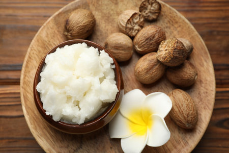 Natural shea butter on wooden table, top view