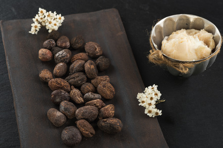 Shea nuts and butter on table, closeup