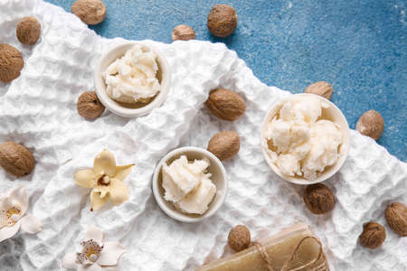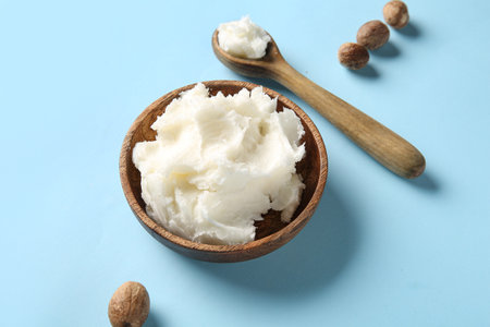 Bowl and spoon of shea butter with nuts on blue background