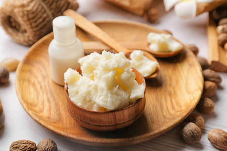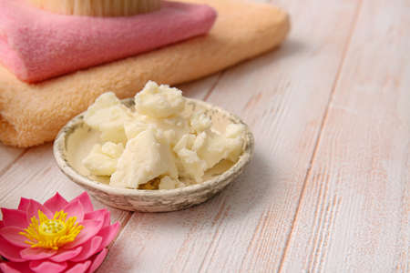 Composition with shea butter on wooden background