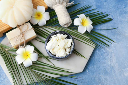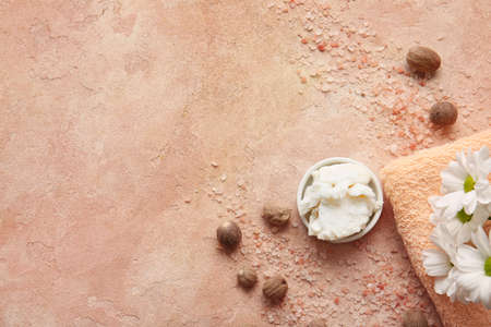 Composition with shea butter and spa accessories on color background