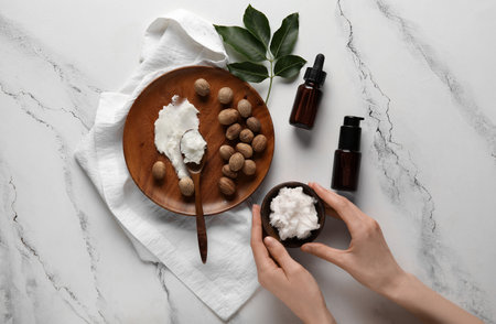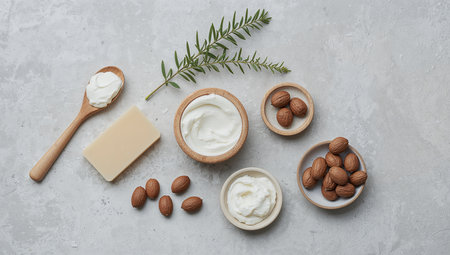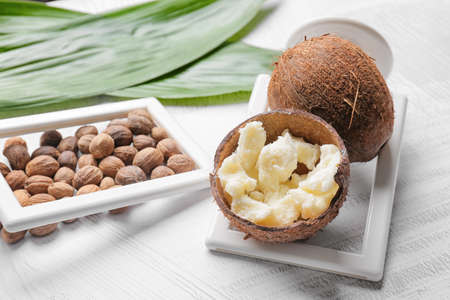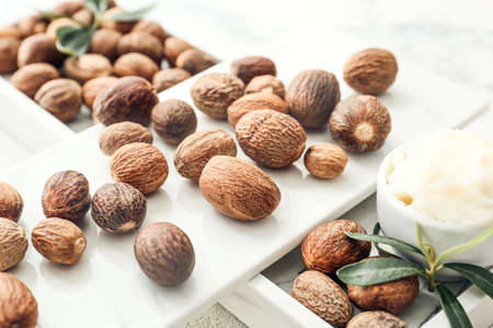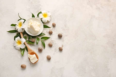 Composition with shea butter and nuts on light background