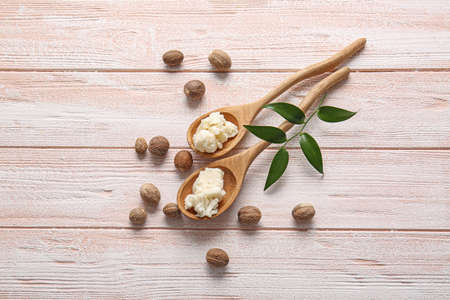 Spoons with shea butter and nuts on light wooden background