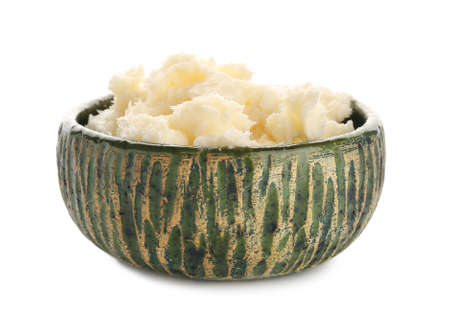Bowl with shea butter on white background