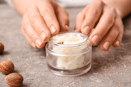 Female hands with jar of shea butter on grunge background, closeup