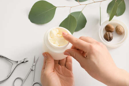 Woman with shea butter and tools for manicure on white background