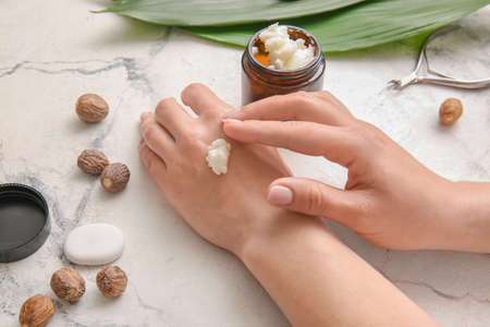 Woman applying shea butter onto hands on light background