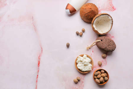 Composition with shea butter, nuts, pumice and coconut on light background
