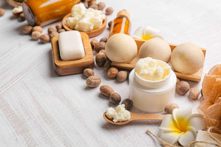 Shea butter, nuts and bath supplies on light background, closeup