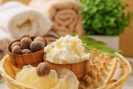 Bowls with shea butter and cream in wicker tray