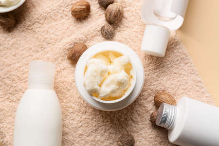 Jar of shea butter, cosmetic products and towel on color background, closeup