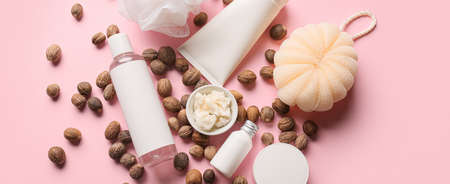 Composition with shea butter and bath supplies on pink background
